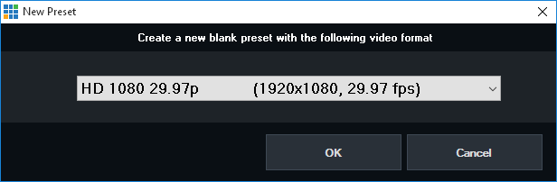 Presets New Preset Creates a new blank Preset and optionally changes the current output video format.